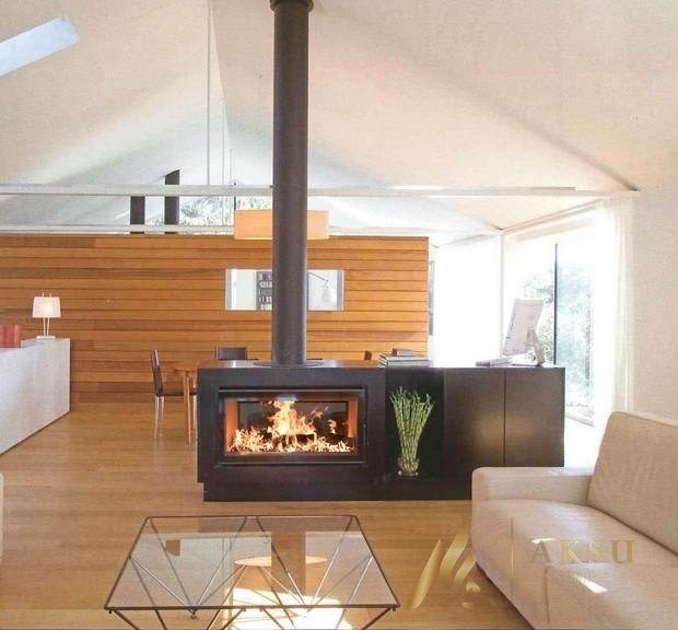 Çift yönlü camlı şömine tasarımıyla iki alandan alev görüntüsü