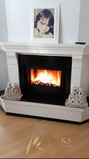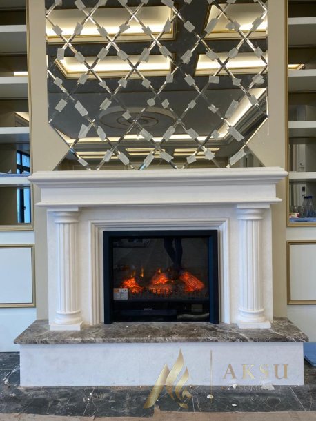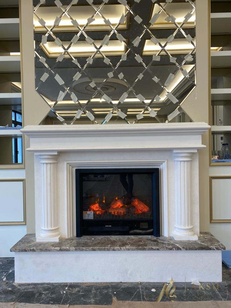 Elektrikli köşe şömine modeli , Antalya Limra taşı ve Siyah granit iç çerçeve kullanılarak yapılan dış modele , gerçeğe en yakın elektrikli şömine haznesi yerleştirilmiştir.