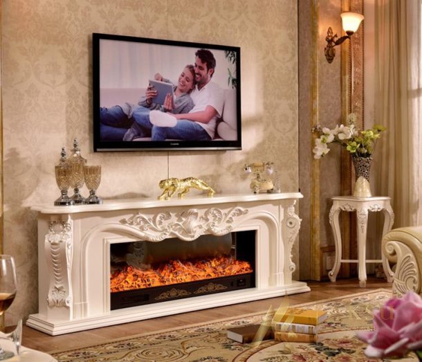 Ahşap işlemeli model elektrikli şömine,beyaz ve kahverengi modelleri ile klasik model sevenler için muhteşem bir tasarım.