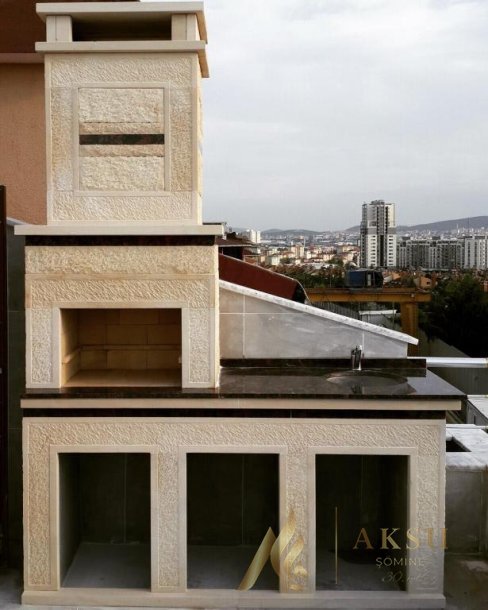 Kandıra Taşı kaplama tezgahlı barbekü, siyah granit tezgah ile bütünlük sağlanmıştır