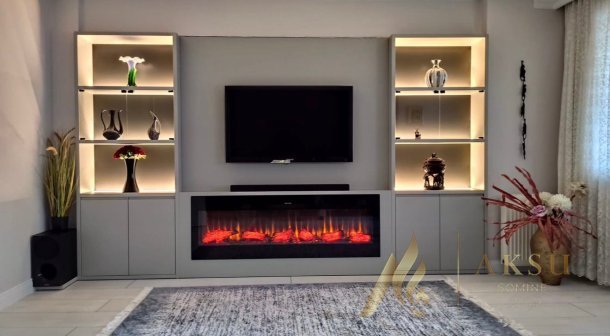 Tv ünitesi altına Flameline elektrikli şömine yerleştirilmiştir, Sizde vereceğimiz ölçülere göre ahşap tv ünitenizde şömine için boşluk bırakabilir,ünitenizin tasarımı bittikten sonra şöminenizi monte edebilirsiniz.Aksu Şömine birbirinden farklı seçenekleri ile mekanlarınız hem şık,hem sıcak...