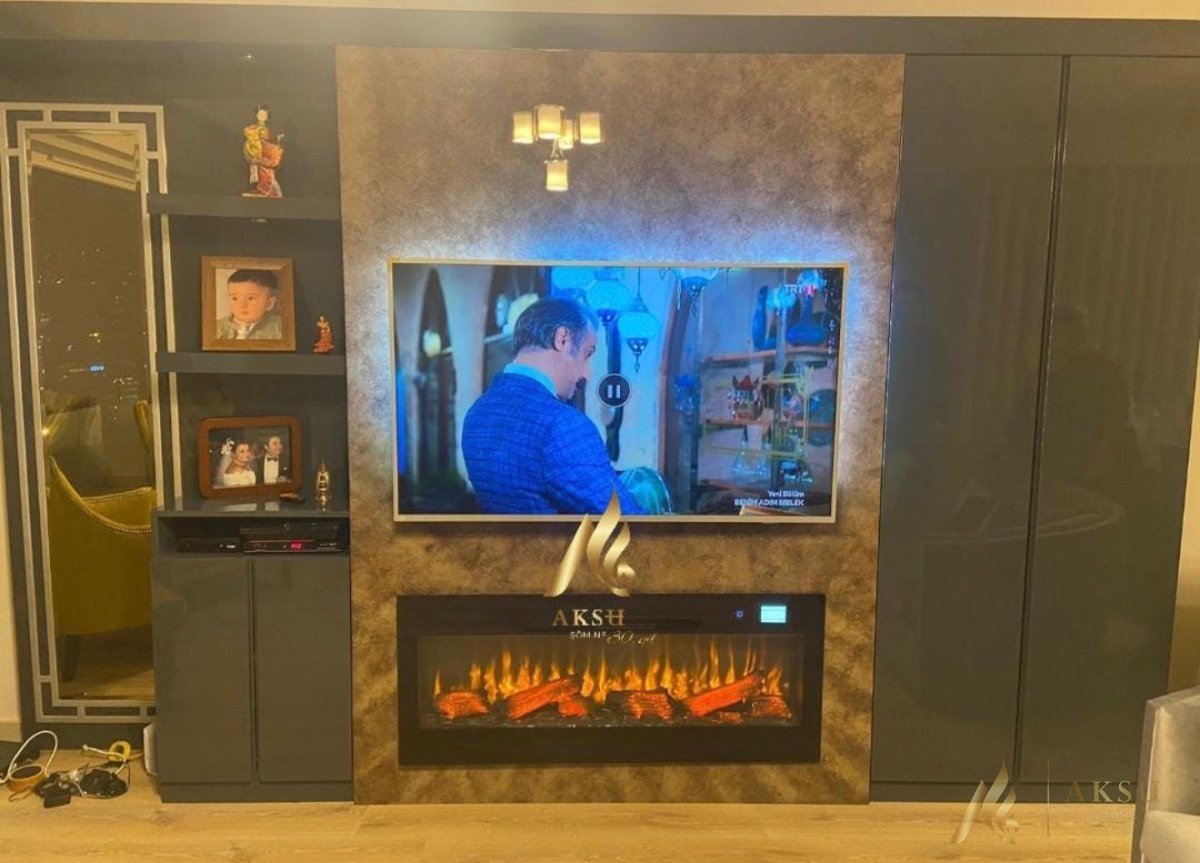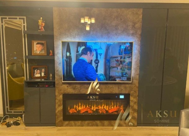 Aksu Şömine birbirinden farklı seçenekleri ile mekanlarınız hem şık,hem sıcak...130 cm lık elektrikli hazne ve mdf kaplama tv ünitesi