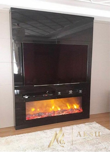 Aksu Şömine birbirinden farklı seçenekleri ile mekanlarınız hem şık,hem sıcak...160 cm lık elektrikli hazne ve siyah granit kaplama tv ünitesi