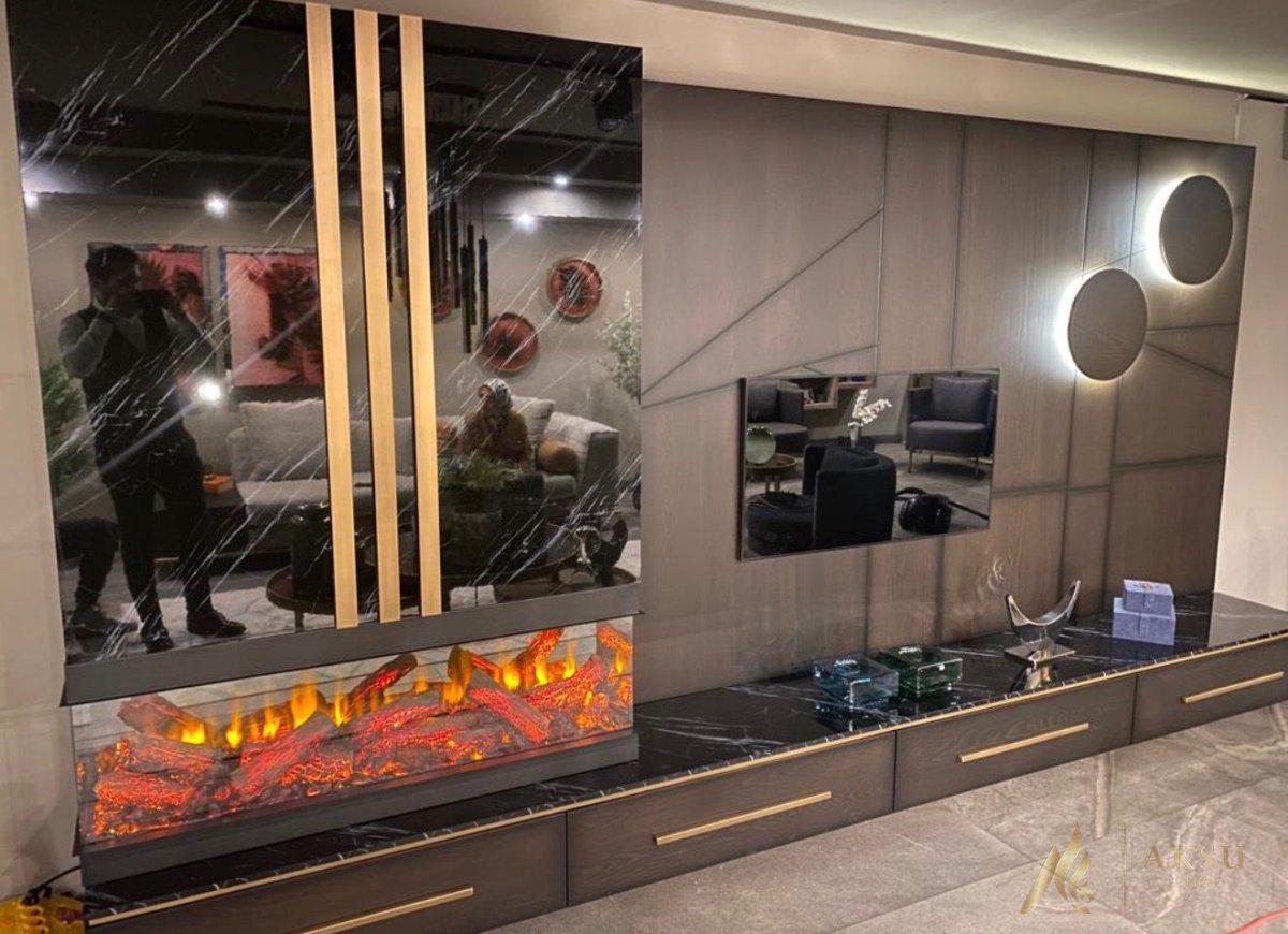 Aksu Şömine birbirinden farklı seçenekleri ile mekanlarınız hem şık,hem sıcak...Üç Açık Flame Line Elektrikli şömine kullanılmıştır. Tv ünitesi tasarımları istenilen ölçülerde yapılabilir. Yerinize göre tasarım yapılarak sunumu yapılır.