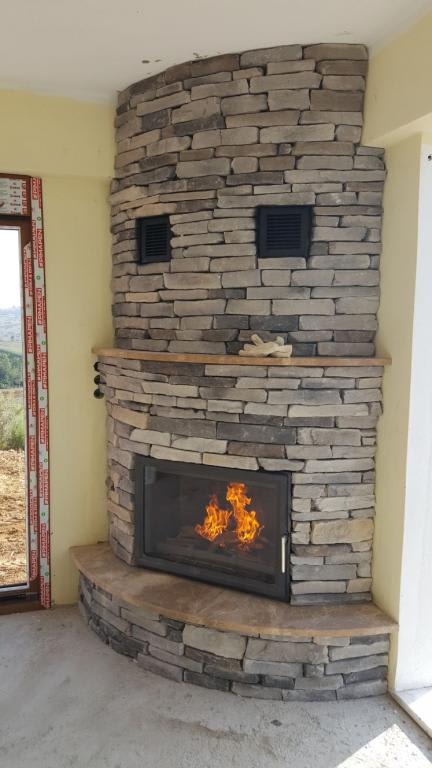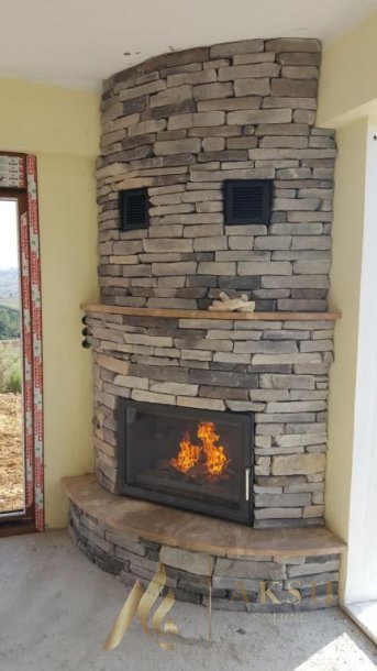 Grand Canyon Taşı kaplama ile oval köşe şömine şekli verilmiştir,Küşeste önlerinde Emprador Light mermer kullanılmıştır,