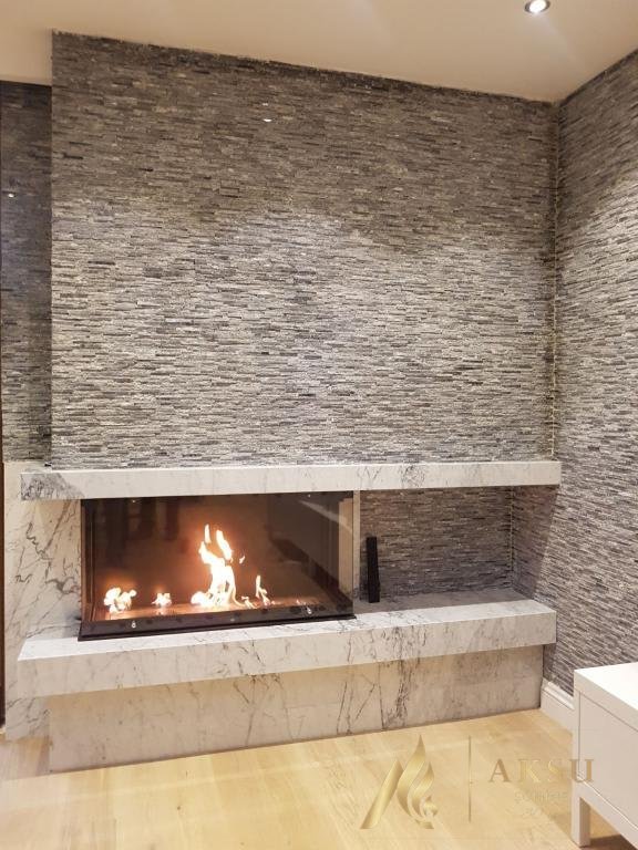 Taş kaplama ve mermerin buluşması, modern şömine tasarımlarımızla hizmetinizdeyiz