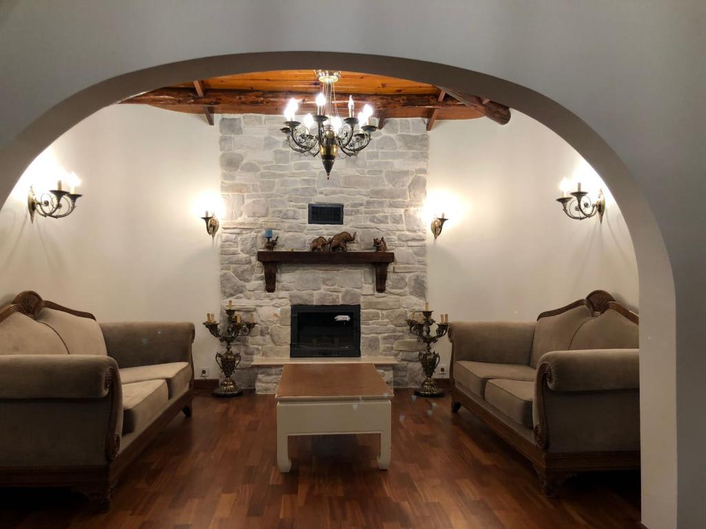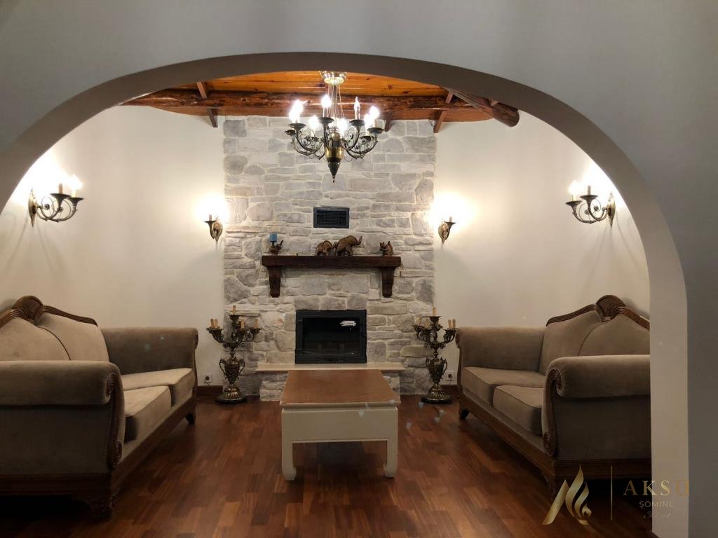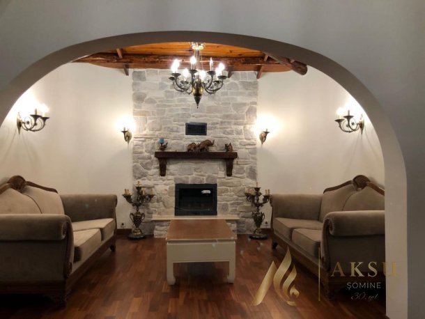 Kayrak taşı kullanılarak şömine ve duvar üzeri tamamen örülmüştür. Ahşap raf kullanılmıştır. 70 lık standart pik döküm hazne kullanılmıştır. Farklı ebatlarda hazne ile de montaj yapılabilir