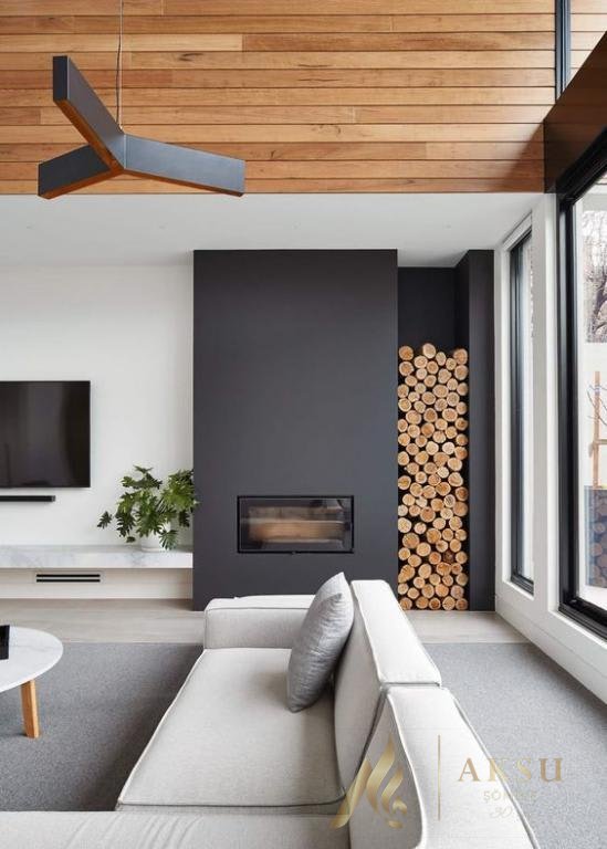 Düz sade ve çok şık bir tasarım,dış yüzeyi sadece mat gri sıva boyadır.Yan tarafındaki odunluk tasarımı ile zun yıllar kullanabileceğiniz bir model