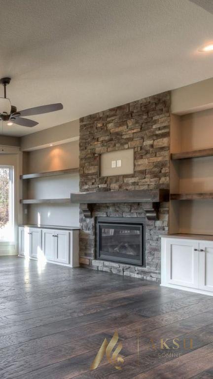 İki yanı kitaplık niş ve taş kaplama şömine olarak tasarlanmıştır