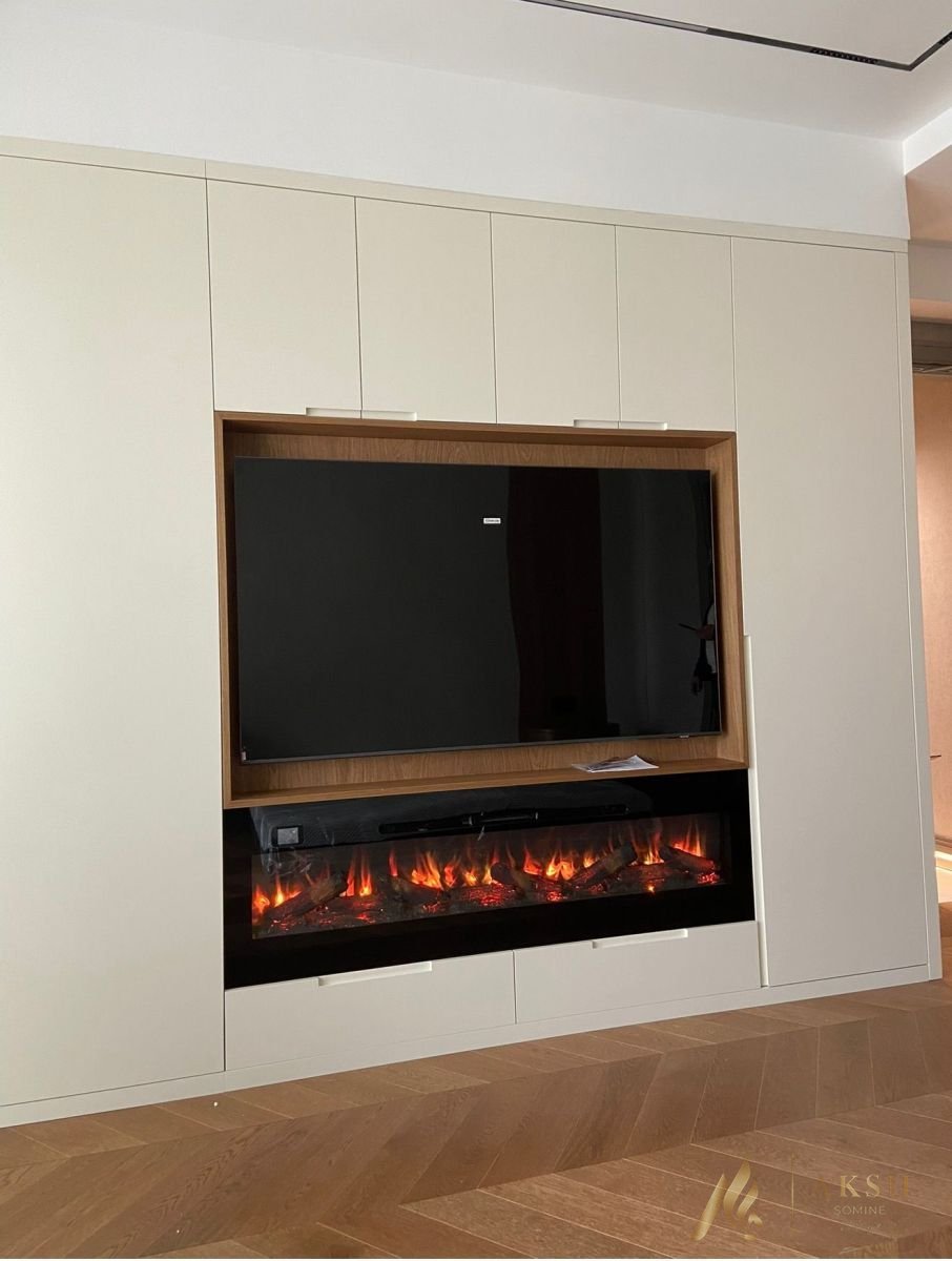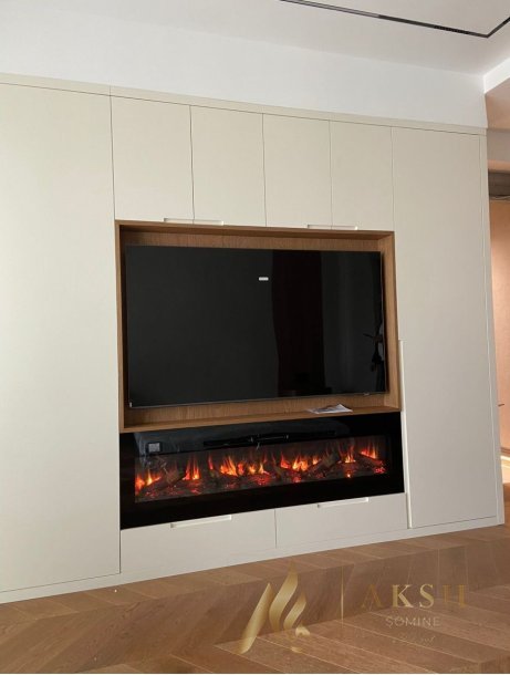 Tv ünitesi altına Flameline elektrikli şömine yerleştirilmiştir, Sizde vereceğimiz ölçülere göre ahşap tv ünitenizde şömine için boşluk bırakabilir,ünitenizin tasarımı bittikten sonra şöminenizi monte edebilirsiniz.Aksu Şömine birbirinden farklı seçenekleri ile mekanlarınız hem şık,hem sıcak...
