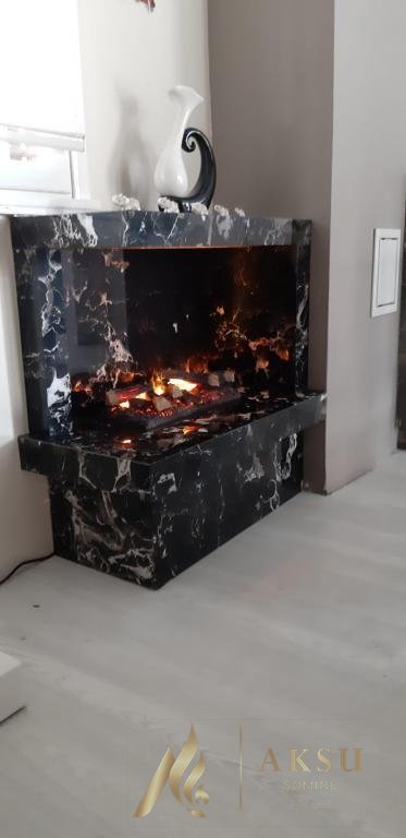 Köşe şömine olarak tasarlanmış model siyah damarlı granit kullanılarak 60 cm lık üç boyutlu elektrikli şömine haznesi kullanılarak dekorasyon tamamlanmıştır. Köşe model sol tarafı açık olarak tasarlanmıştır, aynı zamanda sağ tarafı açıkta yapılabilir. Aynı modelde daha büyük ölçüdede yapılabilir