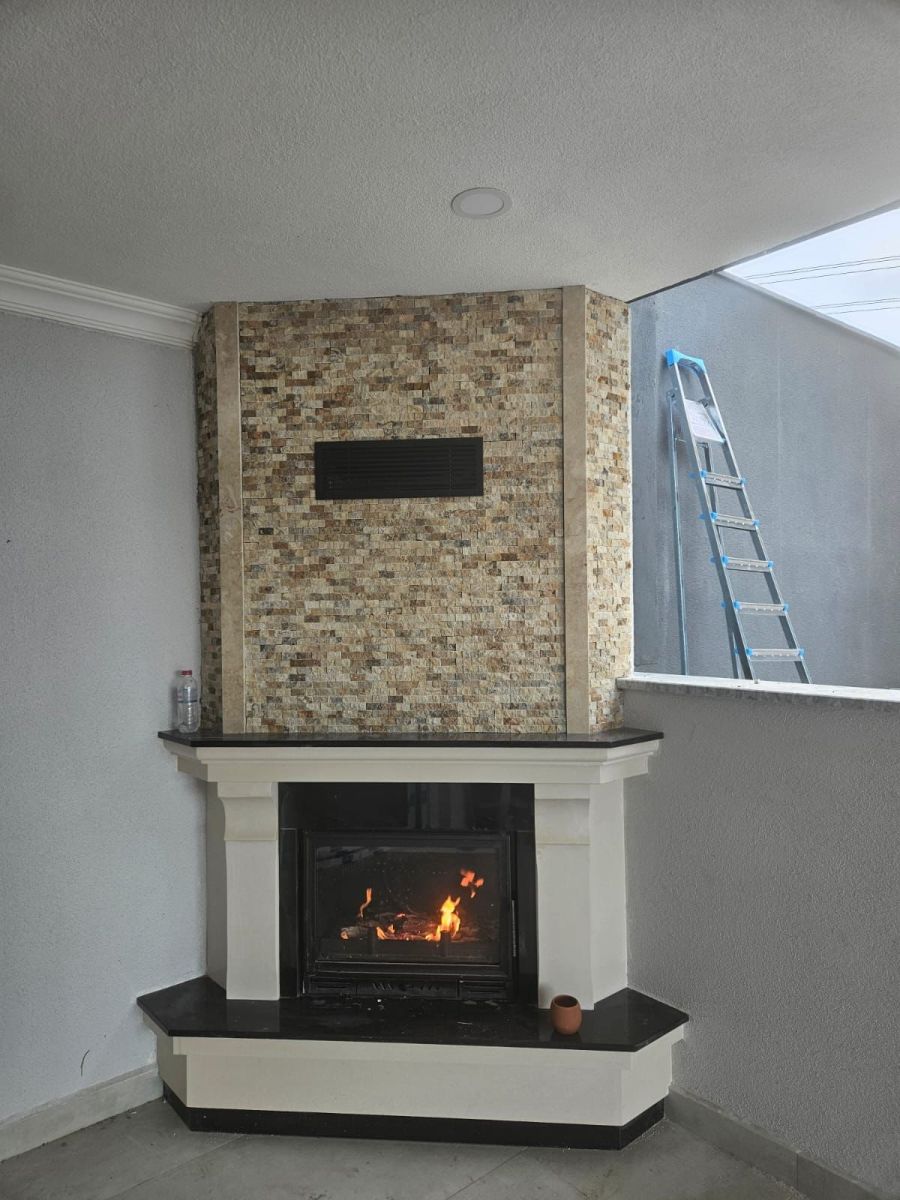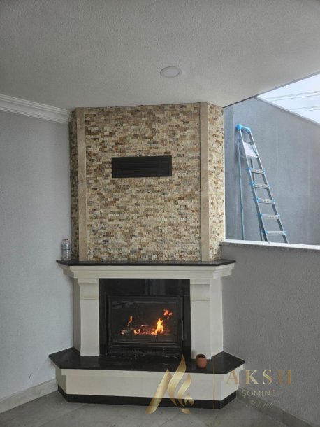 Ana gövdesinde kullanılan Antalya Limra taşı, doğallığıyla öne çıkarken; şömine üzerindeki siyah granit, tasarıma güçlü ve modern bir duruş kazandırır.