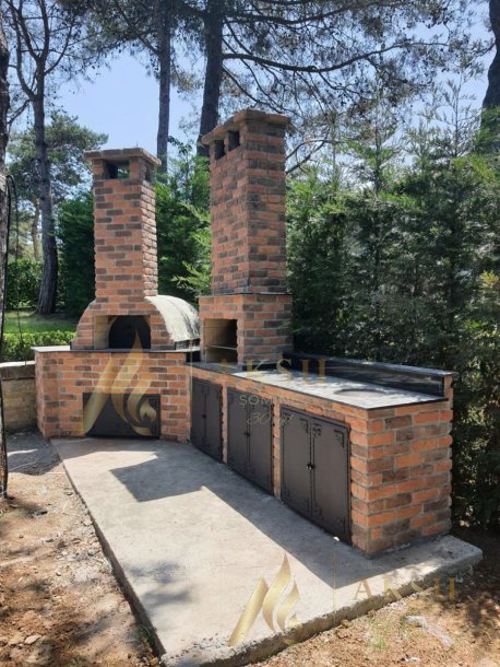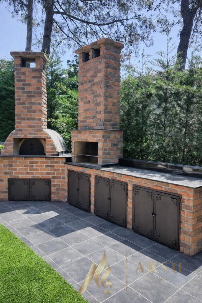 Bu özel sistem, sol tarafta yer alan kubbe formundaki odunlu taş fırın ile geleneksel tandır, ekmek, güveç ve pizza gibi lezzetlerin pişirilmesine olanak tanırken, sağdaki ızgara alanı mangal keyfi için ideal bir ortam sunar. Aynı anda hem fırın hem barbekü kullanılarak bahçede tam donanımlı bir açık hava mutfağı kurulur.